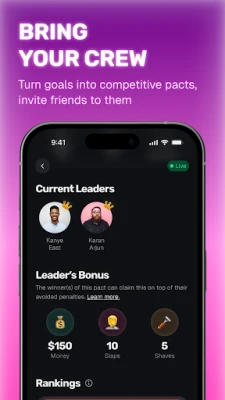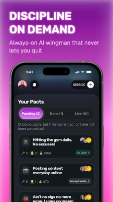- Real Points : Start with 10,000 points. Commit them on pacts. Win them from friends who fail. Build your score like it's your net worth.