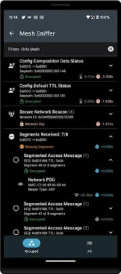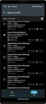 Note: This app does not scan messages sent over GATT bearer. Messages sent from a phone to a GATT Proxy node will not be captured. Messages retransmitted over ADV bearer will.