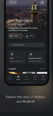 The application provides an exceptional digital experience, helping travelers plan their journey, coordinate arrivals and departures, navigate transportation, and carry out sacred rituals at the Two Holy Mosques.