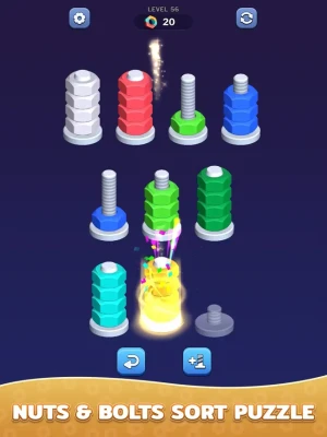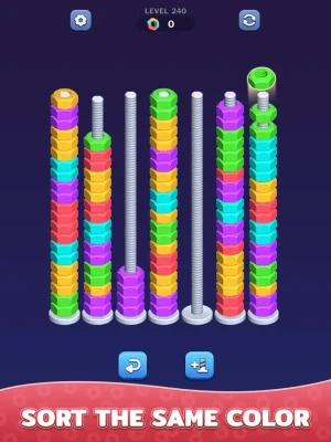 If so, Nut Sort Games - Color Sorting is the perfect puzzle game you've been searching for! In this engaging nuts and bolts color-sorting game, your mission is to tap and stack the messy nuts on the bolts by color, creating the perfect sorting sequence. While enjoying the fun of sorting colors, you'll also be able to use the collected nuts to build your dream home after completing each nut sort color puzzle!