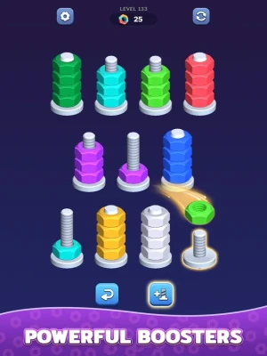 Get ready for endless fun with the FREE nut sort puzzle game! Sort all the nuts by color onto their matching bolts to complete screw puzzles and color sorting games. Perfect for all ages!