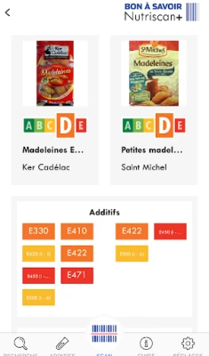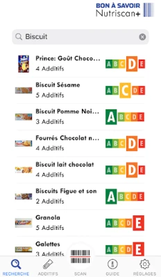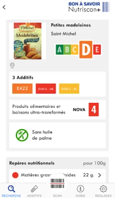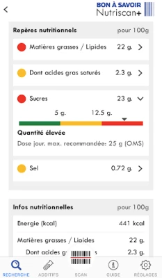 Développée par le magazine suisse d’information et de défense des consommateurs «Bon à Savoir», Nutriscan+ affiche le Nutri-score des produits, le nombre d’additifs qu’ils contiennent, les labels dont ils bénéficient (bio, vegan, sans gluten,..) et le niveau de transformation des matières dont ils sont constitués (classification NOVA).