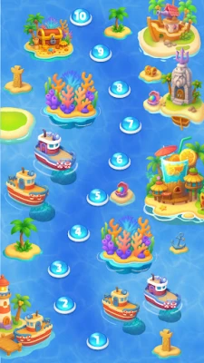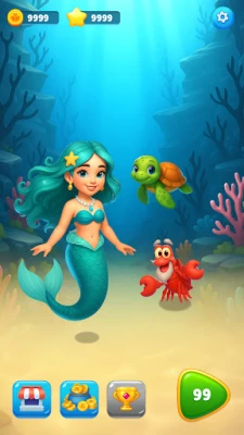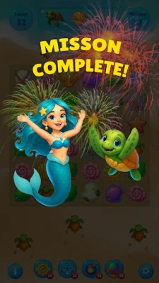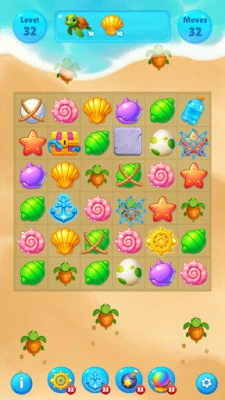 Classic Match-3 Gameplay with New Creativity Ocean Items: Connect items representing underwater life: sparkling shells, starfish, tropical fish, and especially the super-powerful Sea Turtle Gems!