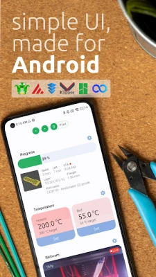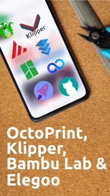 The app supports OctoPrint, Klipper (Moonraker, Fluidd, Mainsail), Bambu Lab and Elegoo Centauri.