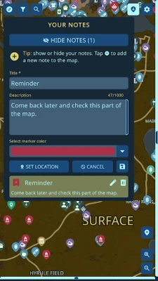 -- Your personal explorer's journal: Add an unlimited number of your own notes to the map. Mark spots for Fuse materials or Ultrahand schematics. Each marker can have a unique name, color, and detailed description for your convenience.