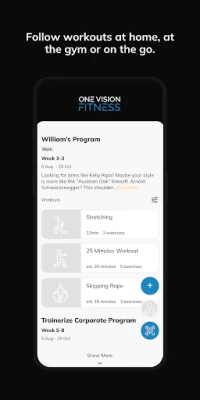 With the One Vision Fitness App, you can start tracking your workouts and meals, measuring results, and achieving your fitness goals, all with the help of your personal trainer.