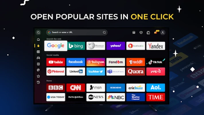 Open - AdBlock android TV Web Browser for smart tv, websites, video, tv shows, anime, movies. Enjoy the Internet: stream movies, series, browse the web, play games, and much more without ads. It's a convenient, secure, multi-functional browser for tv. Simple to use, ads blocking and quick access to your favorite sites. Search for anything safely and be sure of the result. It includes features such as bookmarks, browsing history, search engines shortcut, and cookies blockers. Search for anything safely and be sure of the result. Use incognito mode for more anonymity.