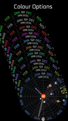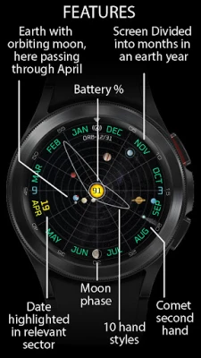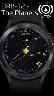 ORB-12 provides a view of the 8 planets in our Solar System as they orbit the Sun. The watch face shows the approximate current angular position of each planet. The background is split into 12 segments representing the months of an Earth year. The Earth makes one rotation around the face per year.