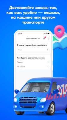 Свобода передвижения. Выбирайте как доставлять заказы — пешим курьером, на велосипеде, самокате или в качестве водителя-курьера на личной машине.