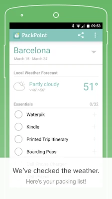 PackPoint will organize a packing list and luggage checklist for your luggage that takes into account: