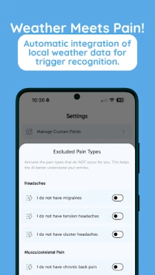 For users who require more detailed tracking, the app allows for the creation of custom fields, providing a tailored experience for individual needs. Medical reports can also be uploaded, and specific pain types can be excluded from the AI analysis for more accurate insights. The app ensures data security with backup and restore functionality, preventing data loss.