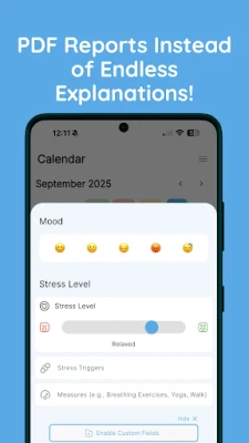 Pain can often be influenced by emotional and psychological factors. That’s why this app includes features for tracking your stress levels and mood. Using a scale from "relaxed" to "overwhelmed," you can record your stress levels and quickly select your current mood using emojis. This allows you to gain a better understanding of how your emotional state might impact your pain levels.