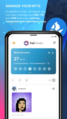 • NFT SUPPORT: Collect and manage your ERC721 and ERC1155 collections across chains in a streamlined interface, directly integrated with OpenSea and Luxy. We're actively expanding our support to include innovative token standards, transforming NFTs into more than just collectibles—your digital unlockables, identities, and event accesses will all find a home in Pali.