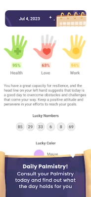 Not only do we provide a completely free, traditional palm reading, but we also track the daily changes in your palm lines. What does today have in store for you? Discover your daily levels of love, health, wealth, and work, as well as your lucky number and color for the day.