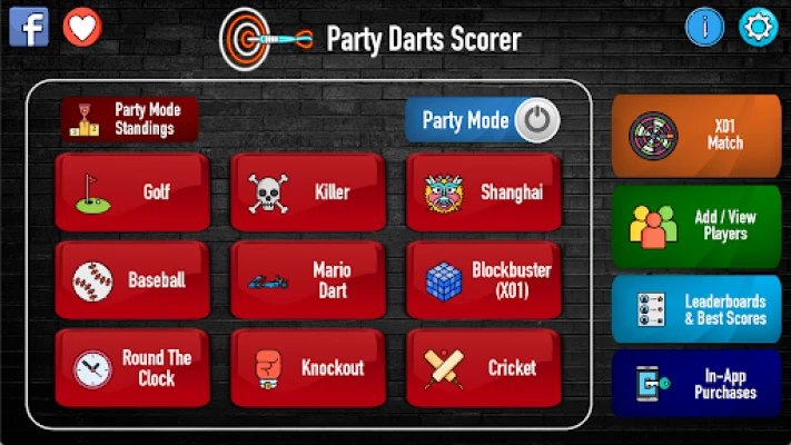 Party Games include: Golf Shanghai Round The Clock Blockbuster (X01) Mario Darts Knockout Cricket Killer Baseball