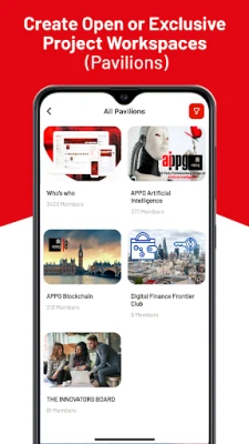 • Build your own open or exclusive project communities and source members from the Pavilion Platform community or your professional contacts.