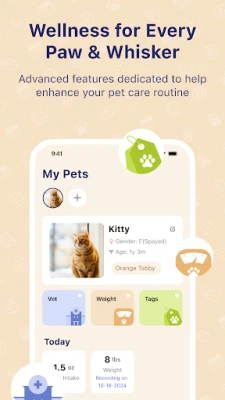 Pet Wellness Our app tracks your pet's feeding data, provides pet behavior tags, and many other tools to help you discover changes in their consumption trends. You can also track your pet's visits to the vet, so you know when their next appointment is.