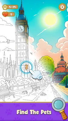 Embark on an unforgettable adventure! With Peek a Pet: Find the cat game, wander through the serene Lotus Gardens, unravel mysteries in the bustling Metropolis, and soak up the sun on Tropical Islands. Discover the magic of Fairy Tales, stroll along the romantic streets of Paris and London, and delve into the secrets of the enchanted Mushroom Plains. From the relaxing vibes of Sunny Beaches to the thrills of Fairgrounds, the eerie charm of Stinky Swamps, and the grandeur of Mansions, each level brings a new world to life in this scavenger hunt. Find out all the hidden pets.