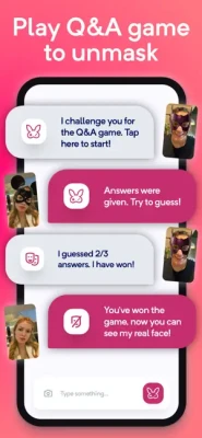 Only a real person can create a profile in our application, and no scammers can add someone else's face to their profile. And you are always sure that the person behind the mask is not a bot, and you have to convince him to take it off! Get creative and rip off the mask!