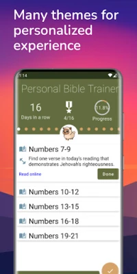 Features include: * Many different schedules * Challenges for each day * Keep track of reading progress and milestones * Earn badges and achievements * Customize your experience using themes