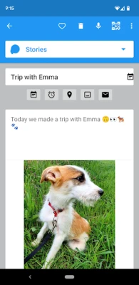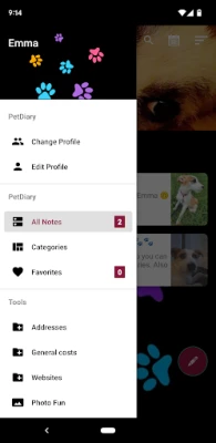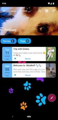 - Make mulitply profiles of all your pets - For every pet you can make your own profile picture and set an own header image - You can save multiple fotos in every diary entry. - You can set a reminder in an existing note and also set a fixed notification in the notifcation bar of your phone screen - You can save importent pet websites - Also you can save adresses of veterinarians - It is possible to make a local backup or a backup on google drive. The backup includes all fotos and will be saved as a zip file. - Sharing the pictures and pet diary story via whatsapp and other apps is also possible.