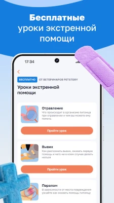 В приложении доступны уроки экстренной помощи для вашего питомца. Они помогут быстро сориентироваться в неотложных ситуациях - если питомец получил травму, отравился или внезапно почувствовал себя плохо. Такие уроки сделаны вместе с ветеринарами и станут надежной поддержкой до обращения к врачу.