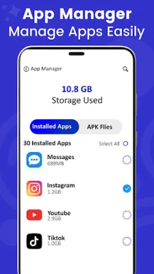 See all installed apps in one place and easily manage them. Select unwanted apps and uninstall them directly from your device to free up space and keep your phone Clean.
