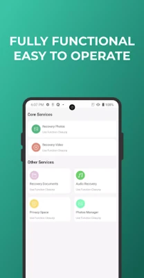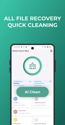 Main functions: Smart Clean Large File Cleanerr Video Clean Battery Info Screenshot Cleaner Duplicate Photos Recovery Photos Recovery Video Recovery Documents Audio Recovery Privacy Space Photos Manager