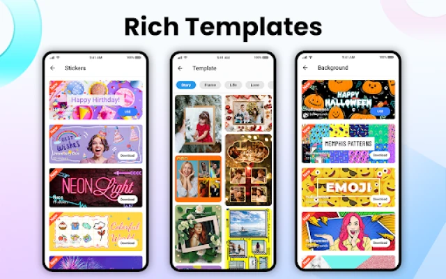 ● 100+ popular design templates, such as Story, Frame, Life, Love, IG, Film, Magazine, Ripped Paper…