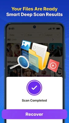 The app performs a smart storage scan to detect recoverable photos, videos, audio, and documents, allowing you to preview and restore them in just a few taps.