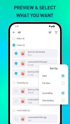 ✅ Filter and Sort Options: After scanning, you can easily filter by file size, date to quickly find deleted photos and other files.