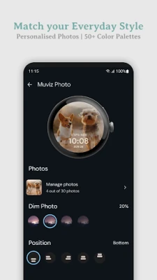 The watch face presents you with 5 clock positions, 50+ handpicked color palettes and option to adjust photo dimness to match your everyday styling.