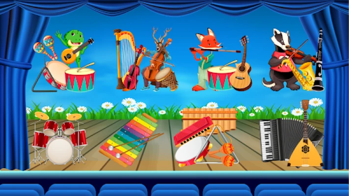 The game features 20 different musical instruments! Winds: French horn, flute, bagpipes, harmonica, saxophone. Strings: acoustic guitar, harp, violin, balalaika, electric guitar. Keyboards: classic upright piano for kids, accordion. Percussion: drums, cymbals, triangle, bell, xylophone, tambourine, maracas.