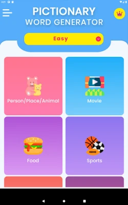 ◆ Pictionary word generator - Easy : Easy game mode consists of Pictionary categories named Christmas, Person / Place / Animal, Food, Sports, Vehicle, Travel, Movies, Funny, Drinks, Vegetables, Fruits, Flowers, Colors, AllPlay, Celebrities, Holidays, Householditem, Clothes, Shapes, Tools, Flags, Beginners, Object, Action, Difficult, Idioms, Machinery, Bonestype, Currency, Furniture, MuscialInstruments, Emotions, Symbol.