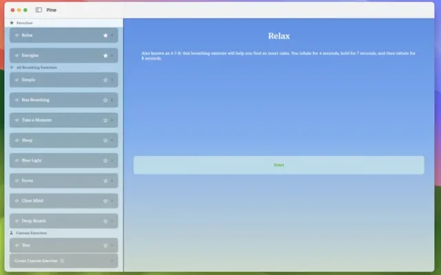 Pine features 8 breathing exercises, each with a specific purpose to help you with your busy day: