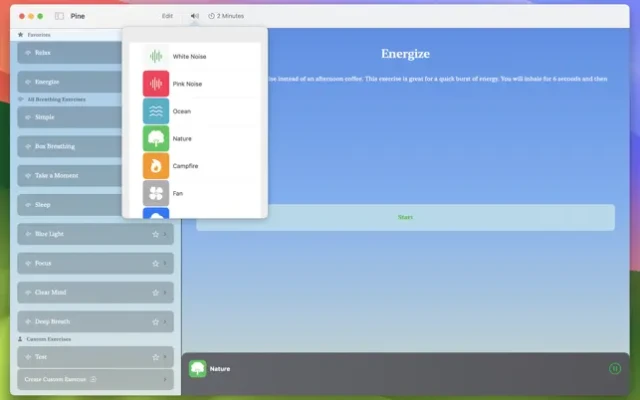 In addition to breathing exercises, Pine features 8 different high quality ambient sounds: White Noise, Ocean, Nature, Rain, Campfire, Stream, Fan, and Thunderstorm. These ambient sounds are great ways to escape from the present moment, focus on your work, or to help you find calm and peace in yourself.