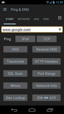 Displays lots of network information and diagnostics: Ping a server (via ICMP over IPv4 or IPv6 and TCP), DNS lookup (with geographical lookup of IP addresses), reverse DNS lookup, WHOIS queries, inspecting HTTP response headers, trace routes (also with IP address geo lookup), check whether a range of ports is open, scan a host for SSL versions and ciphers, perform Path MTU discovery, look up the location of hosts, check whether it's reachable from the public internet, and determine the risk associated with an IP Address. It also shows details of the current network setup and connection of the device, including netstat information. "Wake on LAN" functionality for waking up machines. The optional "NetSentry" monitors network interfaces and warns when usage limits are about to be breached.