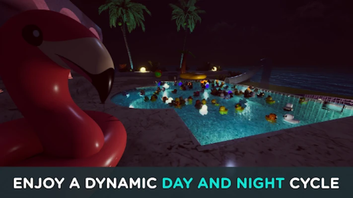 Float on the water, sunbathe, dip your beak, go down the slide. The radio is playing a nostalgic tune.