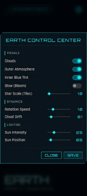Customizable visuals: clouds, atmosphere, glow (bloom), tint, and star scale