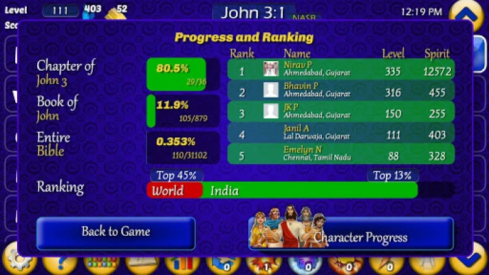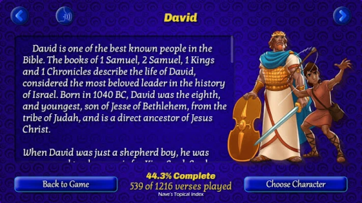 • Character Progress shows you how you are progressing while learning about your favorite characters in each scripture verse