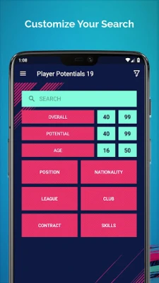 Player Potentials 19 application has 9 different free filter options. With Overall Rating, Potential Rating, Age, Preferred Positions, Nationality, League, Club, Contract and Skill filters it is very easy to search and find players for your career mode team in FIFA 19 game. This application will be your biggest guide during the transfer seasons.
