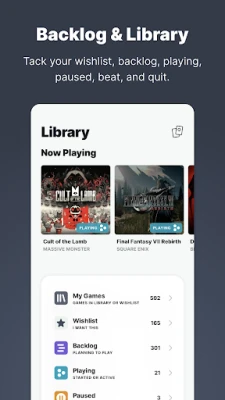 HowLongToBeat — See how long it takes to beat games for different playthroughs, like Main Story, Story and Sides, and 100% Playthroughs, thanks to HowLongtoBeat integration. Plus, see how long it will take to beat your entire backlog. Use HowLongtoBeat’s data to help you manage your game time.