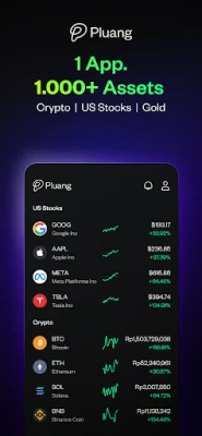 Pluang is a trading app offering over 1,000 investment products in one app: Crypto (Bitcoin BTC, Tether, Dogecoin, BNB, Solana, XRP, and 600+ other cryptocurrencies), US Stocks & ETF (Microsoft, Meta, Google, Nvidia, Tesla, and 650+ other stocks), options trading, crypto futures trading, gold, and mutual funds. Build your crypto portfolio and invest in stocks online with competitive trading fees and a simple UI/UX suitable for beginners and professional traders. Start your trading journey now and achieve your investment goals with Pluang.