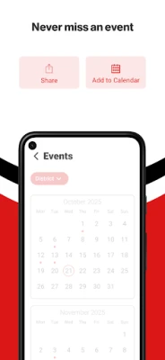NEVER MISS AN EVENT The event section shows a list of events throughout the district. Users can add an event to your calendar to share the event with friends and family with one tap.