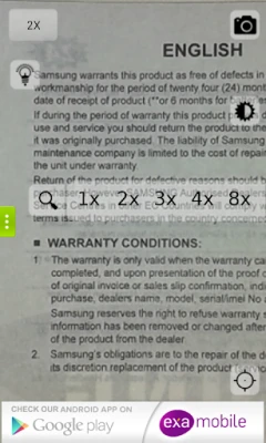 Application magnifier is easy to use, functional and have functions: - zoom x2 x3 x4 x8 - highlighting reading text - function view in negative color - autofocus - to take a pictures / screenshots of magnified image.