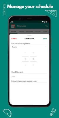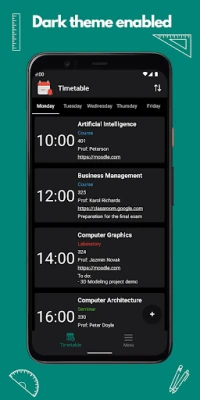 - Simple and easy to use - Manage your schedule - Notifications before the start of any classes - Home screen widgets - Add notes for any class - Import/Export a timetable using a dedicated file or by scanning/sharing a QR code - Add URL/website for every class - Add the teacher and the location of your course - Season themes: Winter Theme - Modify the notification timer (the default timer is 1 hour in advance) - Support for Dark theme