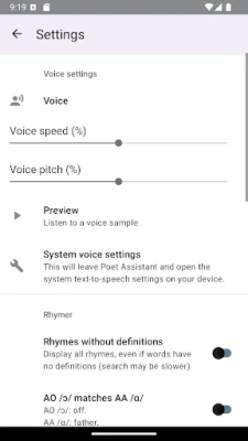 * a screen where you can enter your poem text, have it read aloud back to you by the device's text-to-speech engine, and see the word/character count.