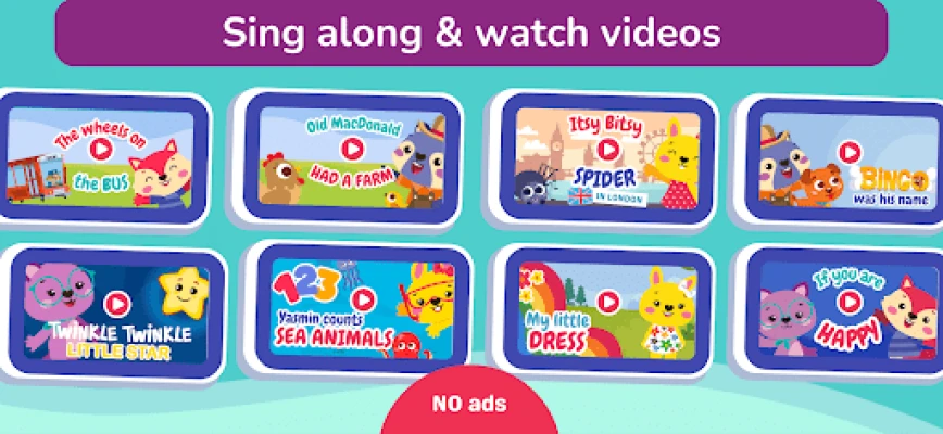 Fun videos with no ads. Our video collection includes popular kids' videos and songs, such as “Wheels on the Bus”, “Old Macdonald Had a Farm”, “Twinkle Twinkle Little Star”, “Itsy Bitsy Spider”, and others. All videos are ad-free.