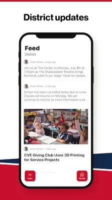 DISTRICT UPDATES In the Live Feed is where you'll find updates from the administration about what's going on in the district right now. Whether that's celebrating a student's success, or reminding you about an upcoming deadline.
