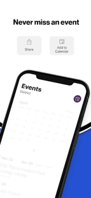 NEVER MISS AN EVENT The event section shows a list of events throughout the district. Users can add an event to their calendar and share the event with friends and family with one tap.